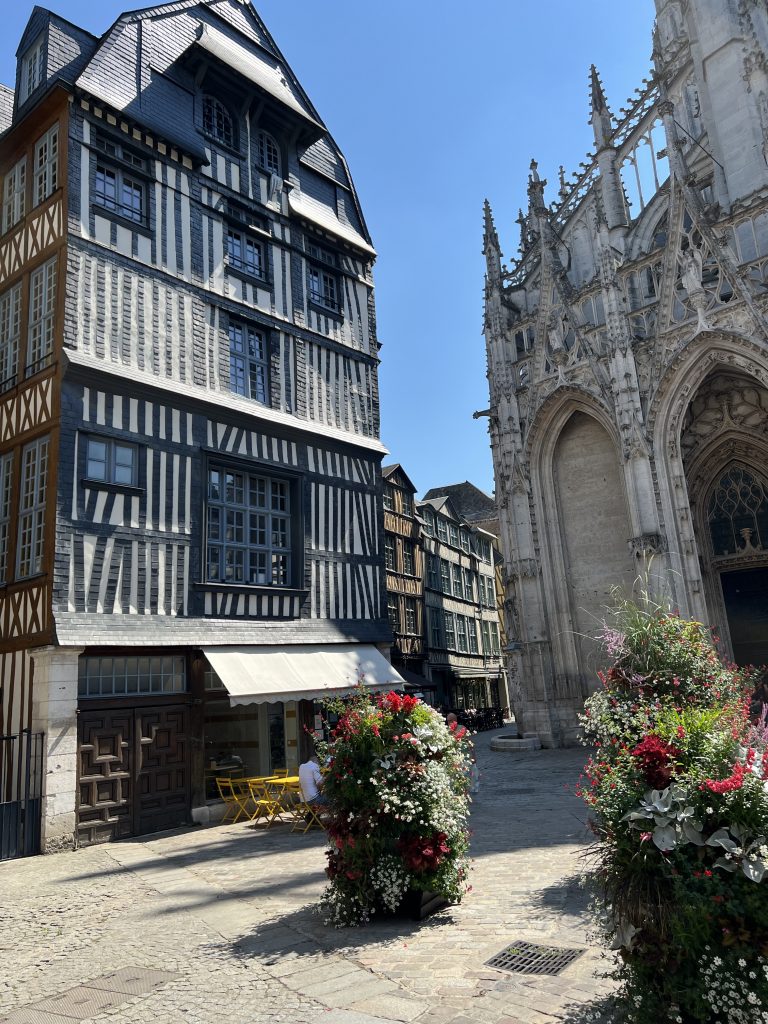 In Bayeux haben wir am Freitag zuerst den weltberühmten Teppich besucht. Mit einem Audioguide wird man recht eng getaktet entlang des Werkes geleitet – aber wohl nur so ist es möglich, die vielen Touristen zu organisieren. Nach dem Original gibt es im ersten Stock eine Ausstellung zur Herstellung des Teppichs, sowie zur Geschichte. Der Teppich hat mich ehrlich gesagt sehr beeindruckt. Wenn ich in meinem eigenen Tempo gegangen wäre, hätte ich garantiert den Betrieb sehr aufgehalten. Ganz, ganz großartig – und leider kann ich gar keine optischen Eindrücke teilen, denn im abgedunkelten und klimatisierten Raum ist Fotografieren kaum möglich.